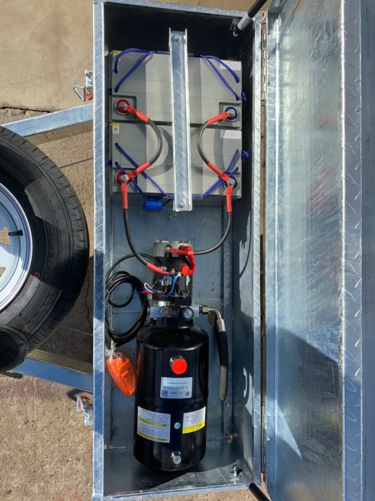 - Lockable toolbox on front of draw bar that holds 2 x 100 amp maintenance free heavy duty batteries complete with electric hand controller
