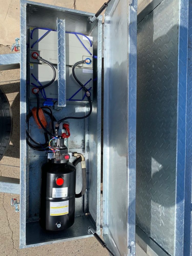 - Lockable toolbox on front of drawbar that holds 2 x 100 amp maintenance free batteries complete with electric hand controller